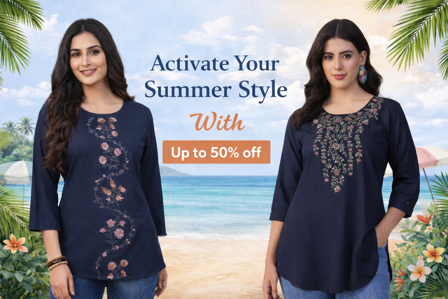 Navy Blue Floral Embroidered Round Neck Tunic